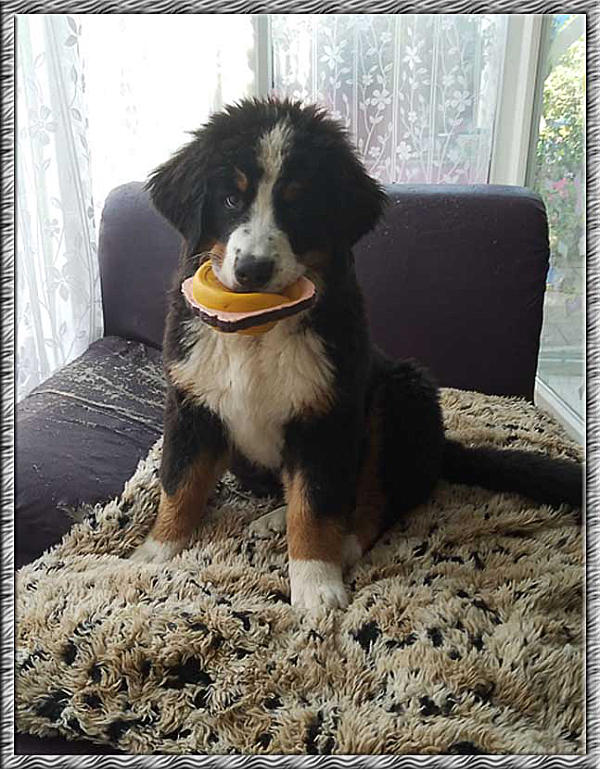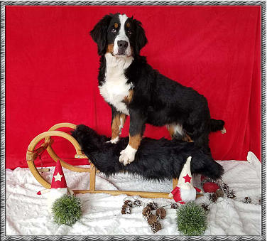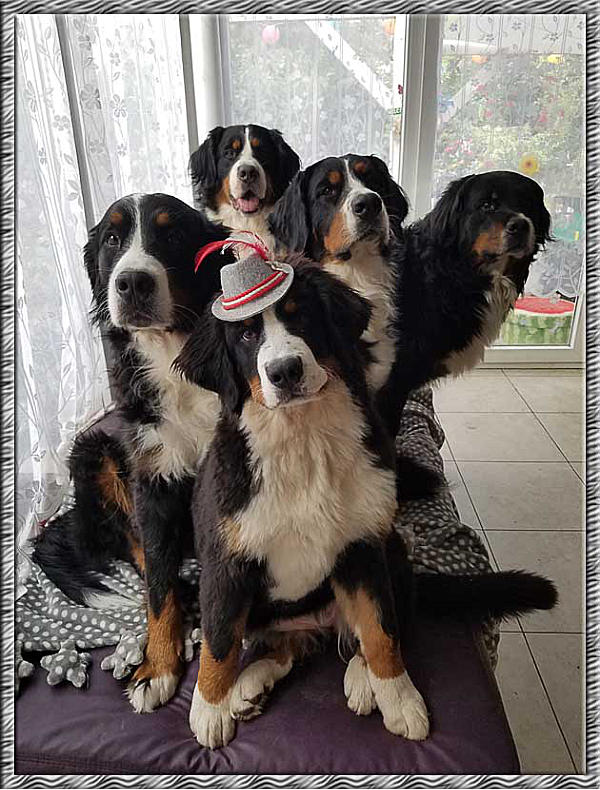 Hanuta wurde am 05. Mai 2017 als “Hedy von Nethanjahu” geboren.Die Eltern sind:Horacio vom Mira BerninaGloria NethanjahuZuchttauglich geschrieben wurde sie am 10.02.2019Sie hatte erfolgreich an folgenden Ausstellungen teilgenommen:10.09.2017: Welt-Jüngstensieger, Formwert vielversprechend (JÜA)08.10.2017: Dachauer-Jüngstensieger, Formwert vielversprechend (JÜA)05.11.2017: Deutschland-Jüngstensieger & “Best in Show”-Sieger, Formwert vielversprechend (JÜA)05.11.2017: Jüngsten-Champion04.02.2018: Bayern-Jugendsieger, Formwert sehr gut (JA)09.09.2018: Welt-Jugendsieger, Formwert sehr gut (JA)07.10.2018: Dachauerland-Jugendsieger, Formwert sehr gut (JA)07.10.2018: Jugend-Champion10.02.2019: Bayern-Sieger, Formwert vorzüglich 1 CACIBHanuta war HD/ED/OCD frei und DM-Exon1 N/N (frei) sowie DM-Exon2 N/N (frei)Als ich Hanuta das erste mal sah war ich sofort verliebt. Wir hatten das große Glück daß Cordula sie uns anvertraut hat. Sie liebte Autofahren was sie gleich beim Abholen unter Beweis stellte.Sie war total aufgeschlossen und somit war sie sofort in unser Rudel integriert. Schokominza lies sie sogar noch an ihrer "Schokomilchbar" mittrinken. Sie fühlte sich hier rundum wohl und machte alles und jedes mit.Gelegentlich war sie etwas aufdringlich bzw. tollpatschig und verstand erste Anzeichen von Ablehnung des Gegenübers nicht! Nicht jeder fremde Hund wollte immer gleich spielen. Schlechte Laune kannte sie nicht, sie war immer gut drauf.Manchmal war sie etwas trampelig, hatte keine Ahnung wieviel Kraft sie hat und polterte schon mal das eine oder andere um.Auch ihr Duracell-Schwanz wedelte das eine oder andere um oder klopfte lautstark gegen alles und jeden.Sie hatte, glaube ich, einen Hang zum Helfersyndrom... sie brachte einem alles mögliche, wenn sie sich freute. Decken, Kissen was auch immer. Das konnte dann auch mal peinlich werden wenn sie zum Wäschekorb rannte und dann stolz unseren Gästen “ihren” ergatterten BH brachte.Gerne trug sie auch Schüsseln jeglicher Art, egal ob gefüllt oder leer, durch die Gegend. Mit Glück war die Schüssel leer, es konnte aber auch mal die gefüllte Wasserschüssel sein - der Inhalt wurde dann über den ganzen Boden verteilt. Oft wurde die Schüssel auch lautstark fallen gelassen, der dadurch entstehende Lärm störte sie allerdings nicht. Je nachdem, aus welchem Material die Schüssel war, wurde danach eine Neuanschaffung notwendig. Seither gibt es hier nur noch Metall oder Plastikschüsseln für die Hunde.Sie war ein Clown durch und durch, mit ihr gab es immer was zu lachen.Wie alle unsere Berner war auch unserer Hanuta ein mobiler Staubsauger, wenn es um Fressbares ging.Ihr ausgeprägtes Schmusetalent stellte sie stets und äusserst gerne unter Beweis. Auch konnte es sein das sie dem Besuch auf den Schoß hopste... sie meinte wohl sie ist ein kleiner Schoßhund.Hier hatte sie alle Herzen im Sturm erobert.Hanuta musste uns leider am16. Februar 2026 verlassen.Die Erinnerung an sie wird für immerin unseren Herzen bestehen bleiben.Ein Hund wird Dir nie das Herz brechen,außer an dem Tag, an dem er gehen muss!Ein guter Hund stirbt nie –er bleibt immer gegenwärtig.Er wandert neben Dir an kühlen Herbsttagen,wenn der Frost über die Felder streiftund der Winter näher kommt,sein Kopf liegt zärtlich in Deiner Handwie in alten Zeiten.(Mary Carolyn Davies)